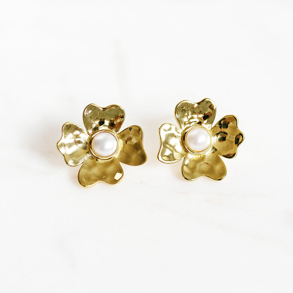 Embrace a touch of nature-inspired elegance with our Hammered Gold Abstract Flower Stud Earrings, each adorned with a lustrous pearl center.